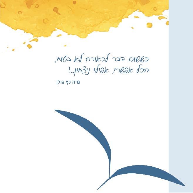 המיתוג שעשינו עבורה נעשה שולב בגווני ג'ינס כחול וצהוב חם. צבעים המשלבים אנרגיה צעירה וחמימות של חיבוק נעים. הגופן המיוחד שבחרנו ואלמנט הציפור בלוגו נתנו את תחושת הבריחה הפנימית והיכולת להתקדם ולצמוח מהמקום הנמוך ביותר לגבוה ביותר.